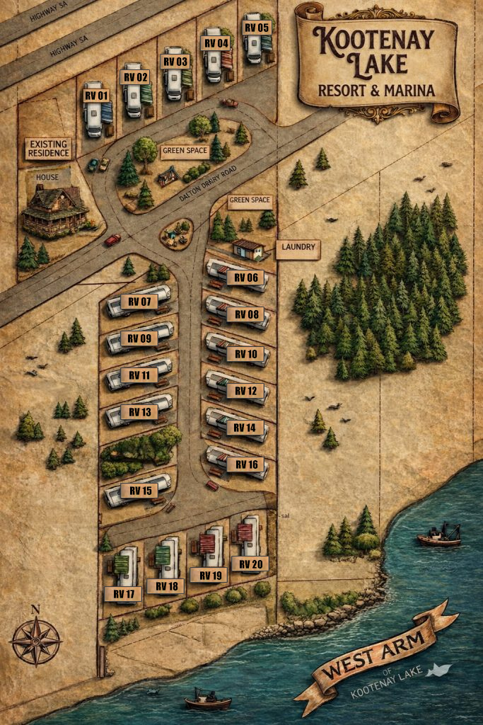 Kootenay Lakeshore Marina RV Resort, located in the peaceful lakeside village of Balfour, BC, is being redeveloped into an exclusive, secure, and seasonal RV ownership community. We offer a permanent, hassle-free waterfront development on Kootenay Lake that can be passed down for generations. Forget the inconvenience of moving your RV; here, you own your spacious, full-service RV site, set within a close-knit community that provides a serene, laid-back lifestyle surrounded by mountains and forests. With only 20 modern RV sites and a modular 2-bedroom home, the Resort ensures direct access to endless outdoor recreation, all secured by an 8ft privacy fence and an electronic access gate for your comfort and safety. Owning a piece of Kootenay Lakeshore is more than a recreational purchase—it’s a valuable, enduring asset.